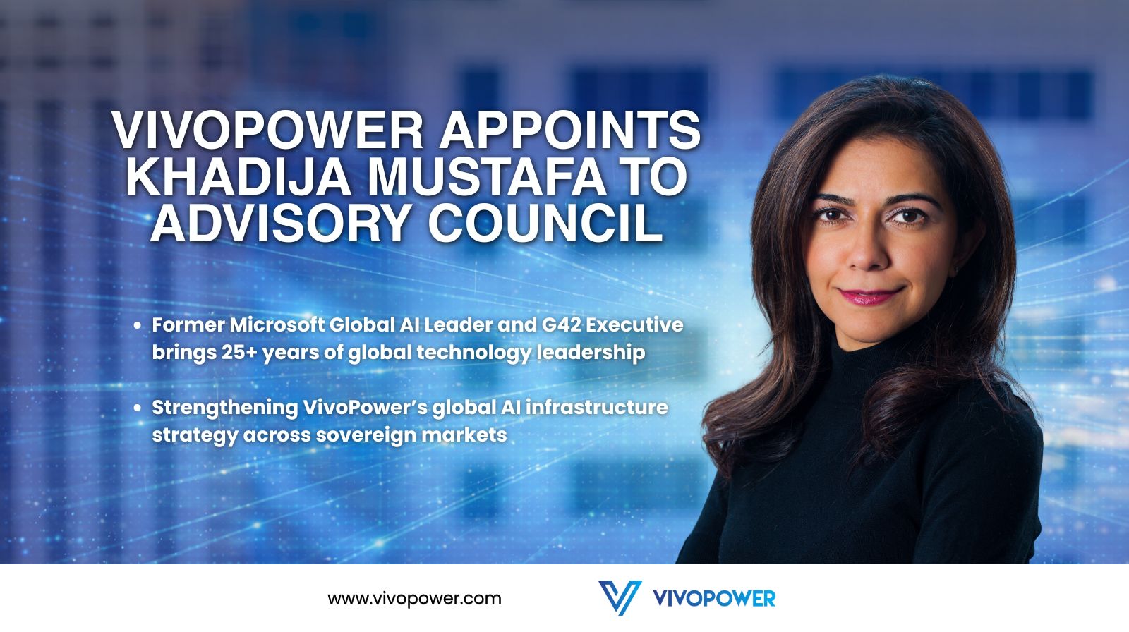 VivoPower PLC (Nasdaq: VIVO) ("VivoPower" or the "Company"), a B Corp-certified global developer and owner of powered land and data center infrastructure for AI compute applications, today announced the appointment of Khadija Mustafa to its Advisory Council. Ms. Mustafa brings over two decades of global technology leadership experience, with deep expertise in artificial intelligence strategy, international partnerships, and business commercialization across the United States, the Middle East, Europe, and high-growth emerging markets.